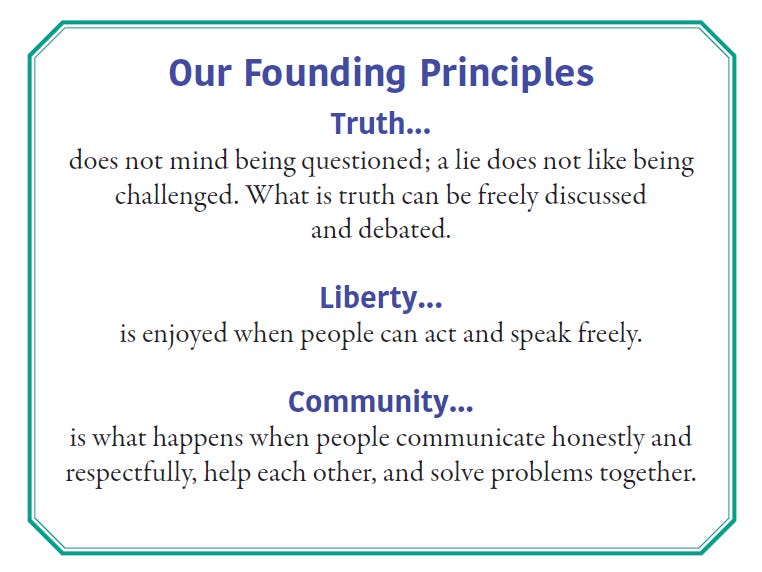 Just as the Freedom Market is guided by the “core values” of “honesty; freedom of speech and bodily autonomy; and freedom to buy, sell and trade with each other,” TLC prints its Founding Principles on the front page of every issue:
