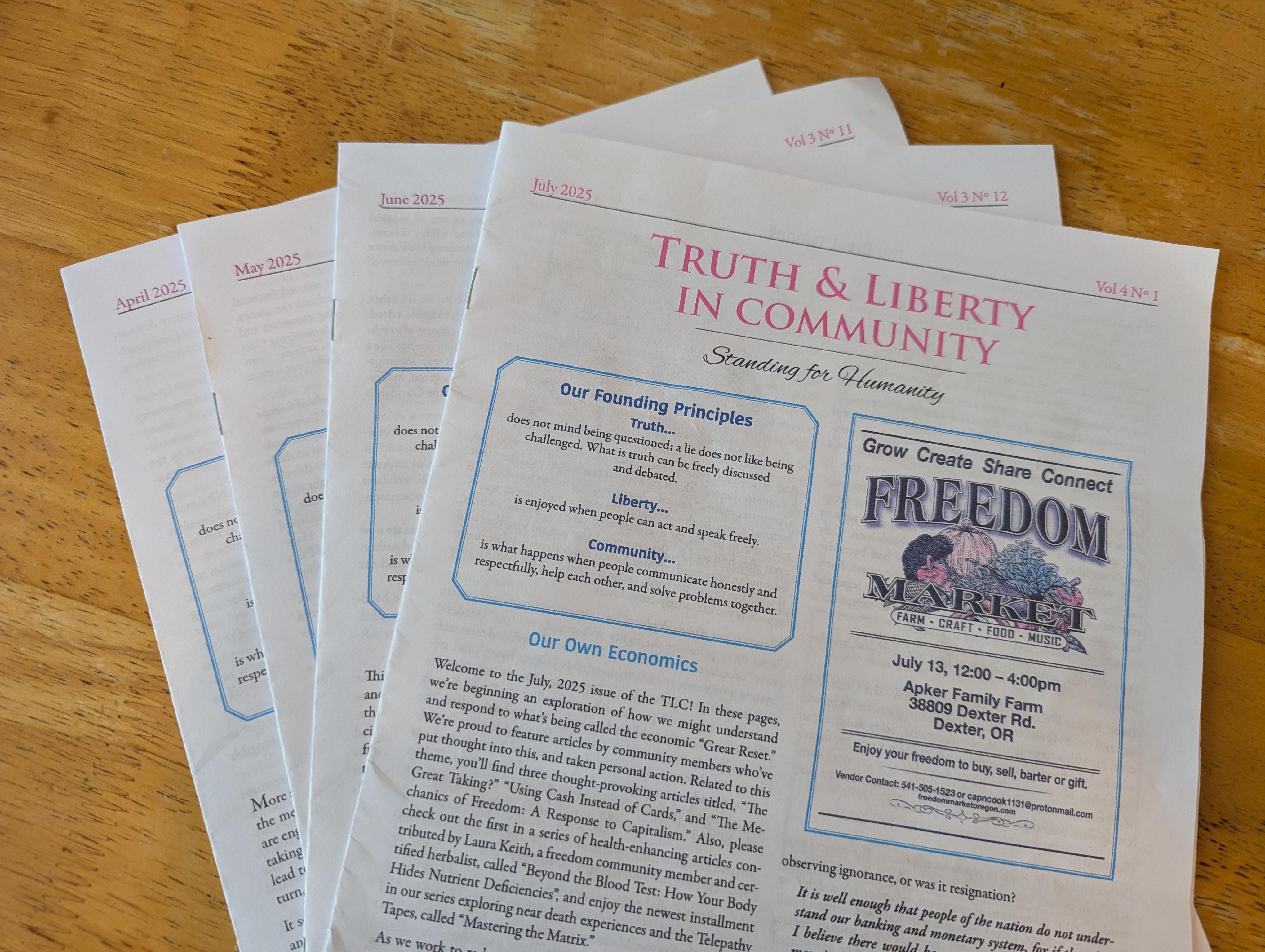 The first issue of Truth & Liberty in Community was published on July 4th, 2022. The newsletter serves as a bridge of sorts between the various community groups that spontaneously arose from the earlier Breathe Free Lane County coalition. TLC is published monthly as an 8-page newsletter. In addition to articles with analysis of local, national, and global affairs, it contains information on the weekly discussion group, monthly Freedom Market, and any gatherings hosted by Sustainers.