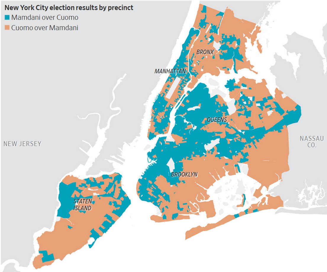 Cuomo’s coalition of finance capitalists and working class voters was not enough to defeat Mamdani’s mobilization of New York’s middle strata: “Mamdani’s win shocked some on Wall Street, where top financiers had backed Cuomo. The former governor won much of New York’s tony Upper East Side, but also working-class neighborhoods in the Bronx and Queens.”