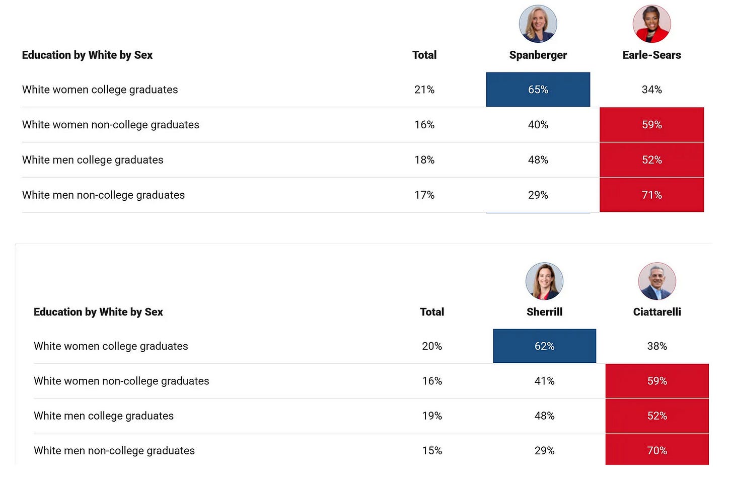 , , and analyze initial voting patterns. Baharaeen writes that “Democratic voters are fired up. This energy produced several big wins for the party, including in races for New Jersey and Virginia governor, the Virginia House of Delegates, the Pennsylvania Supreme Court, and the Georgia Public Service Commission. There was nary a bright spot for Republicans last night. Democrats’ success came in no small part thanks to many Americans’ displeasure with President Trump’s performance so far in his second term.”However, Baharaeen notes that Democratic Party “victories in New Jersey and Virginia were powered by college-educated voters, while working-class voters, who are overrepresented in the national and battleground-state electorates, remain steadfastly against them.” Continuing on this theme, Teixeira observes that the “strong performance among the college-educated continues to be the Democrats’ hole card, especially their strength among white college women. Compare Democrats’ performance among this group to their performance among other white gender/education groups in Virginia and New Jersey. White college-educated women are clearly dwelling in a different political universe than the other groups.”