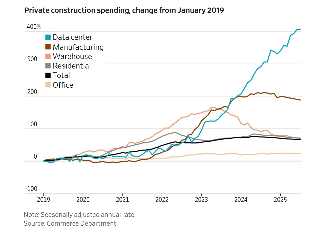The Wall Street Journal reports on the rapid construction of data centers to fund the expanding cloud and AI economy: “America’s tech build-out has minted millionaires in Silicon Valley, helped a record-breaking stock market defy gravity and buoyed an otherwise uncertain U.S. economy. Investment in software and information-processing equipment drove most of America’s GDP growth in the first half of 2025, according to federal data. The top five tech giants—known as hyperscalers in the data-center world—total more than a third of all S&P 500 capital expenditures.”